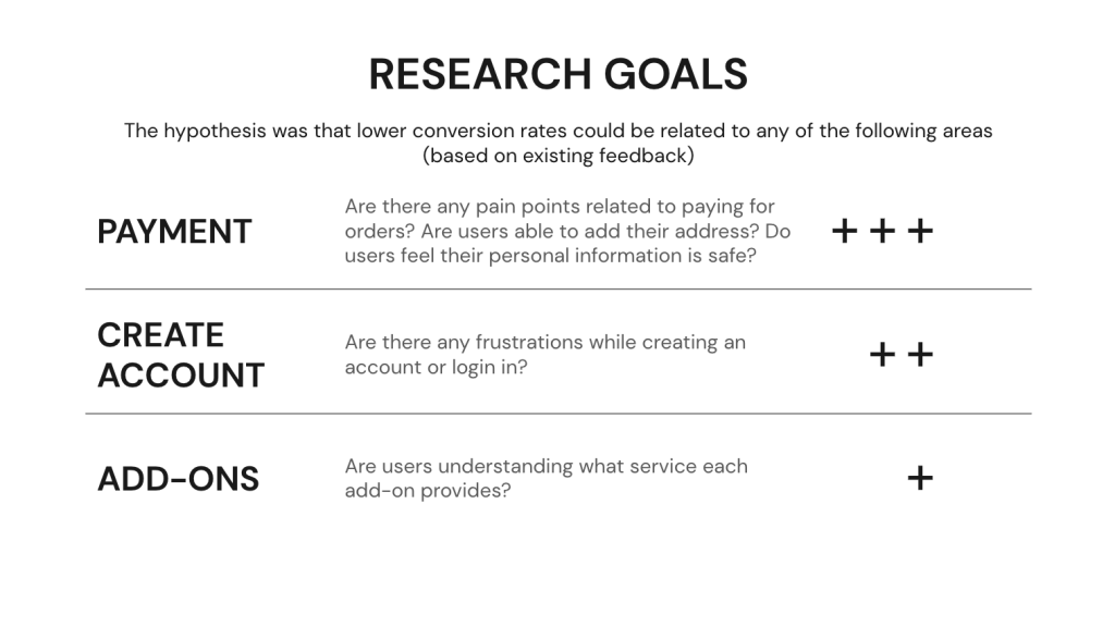 Based on existing research from customer support tickets and reviews, some areas were identified as potentially affecting conversion rates.
