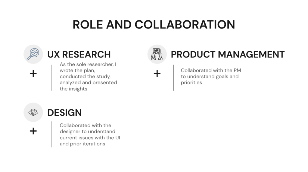 As the sole researcher, I led the project and also collaborated with Product Management and Design.