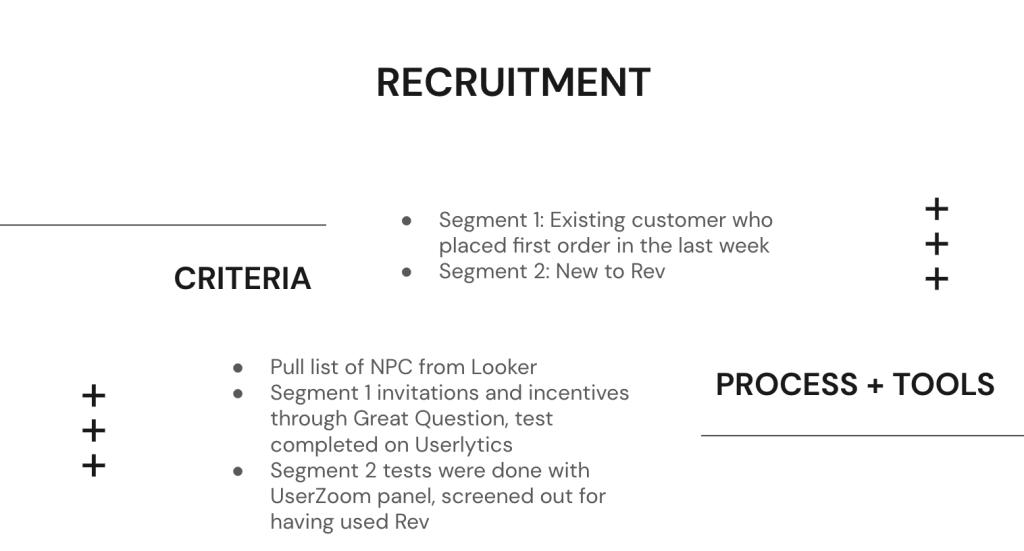 New users were recruited and screened through the Userzoom panel, and existing users were recruited from our own database. Unmoderated usability tests for new users were conducted on Userzoom, and tests for existing users were conducted on Userlytics.