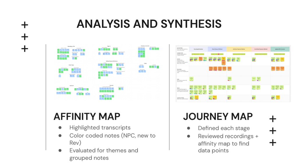 Transcripts and recordings were uploaded to EnjoyHQ to be reviewed and tagged. An affinity map was then created from the highlights to find themes. From there, a journey map was created that identified actions, feelings, pain points, and delights.