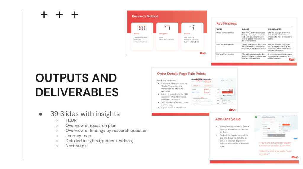 Insights were presented to Design and Product Management. Slides included insights per research question, clips from the recordings, next steps, and recommendations.