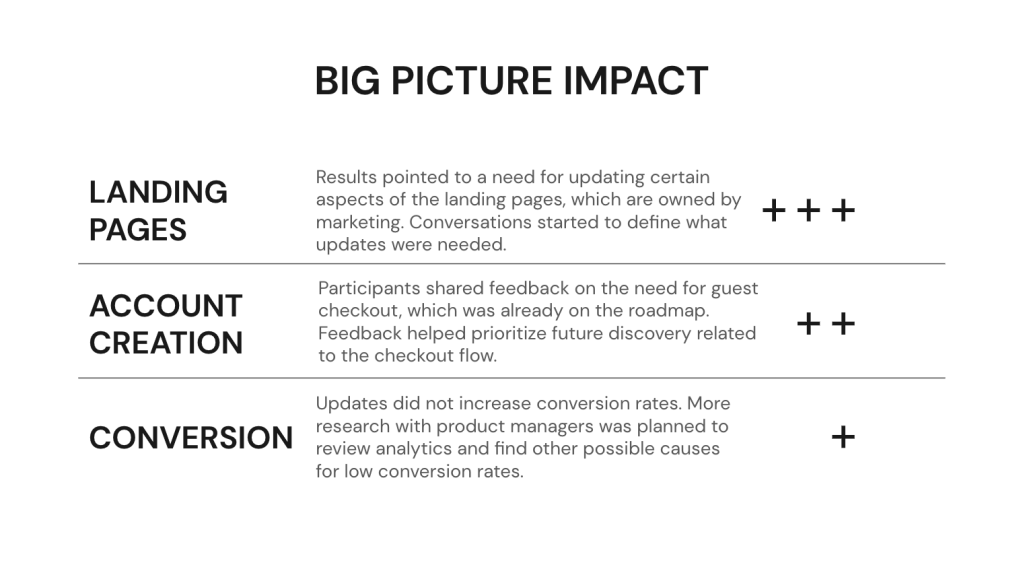 The pain points that were identified were not impactful enough to affect conversion rates, as users were all able to complete checkout and overall felt it was safe. Still, updates were completed to solve the pain points that were found.