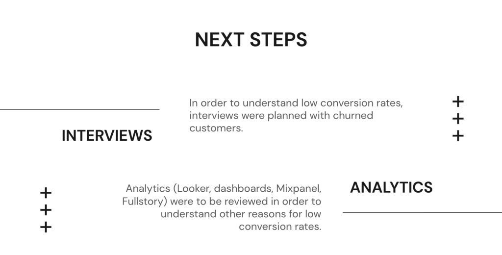 The next steps were planned to understand the possible reason for low conversion rates. These included interviews with churned customers and a deeper analysis of analytics.